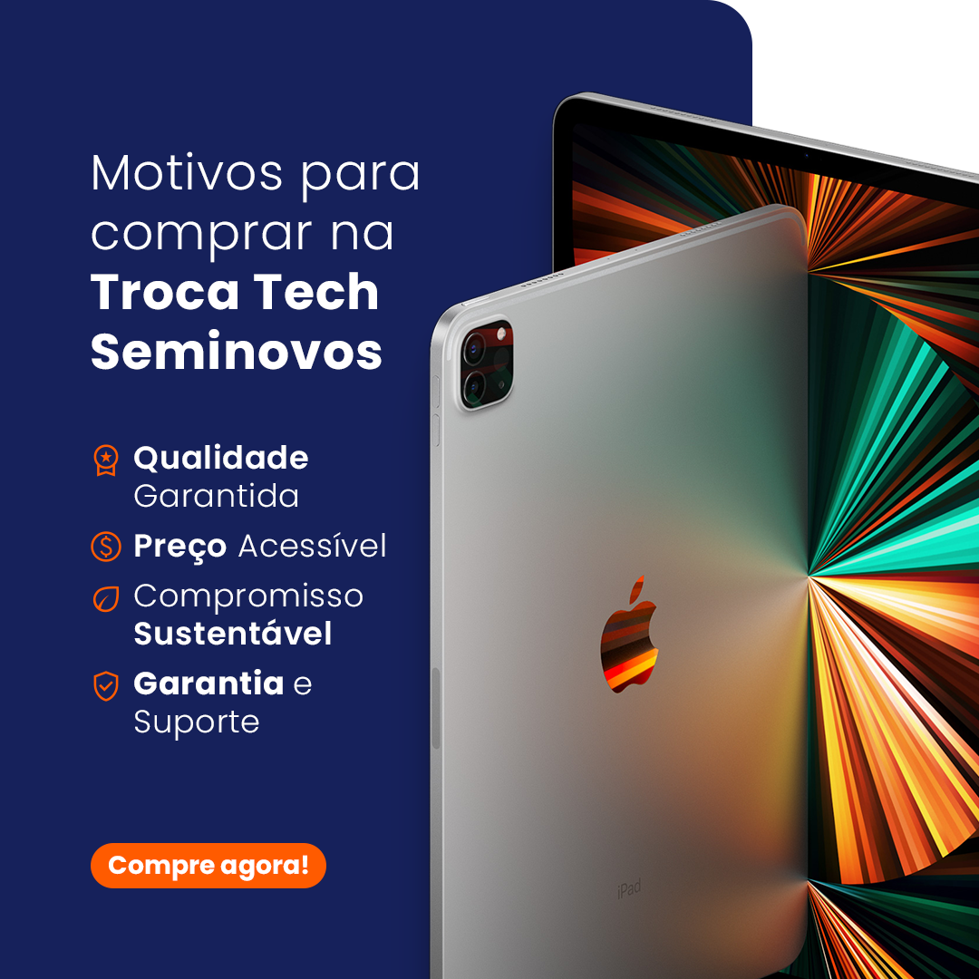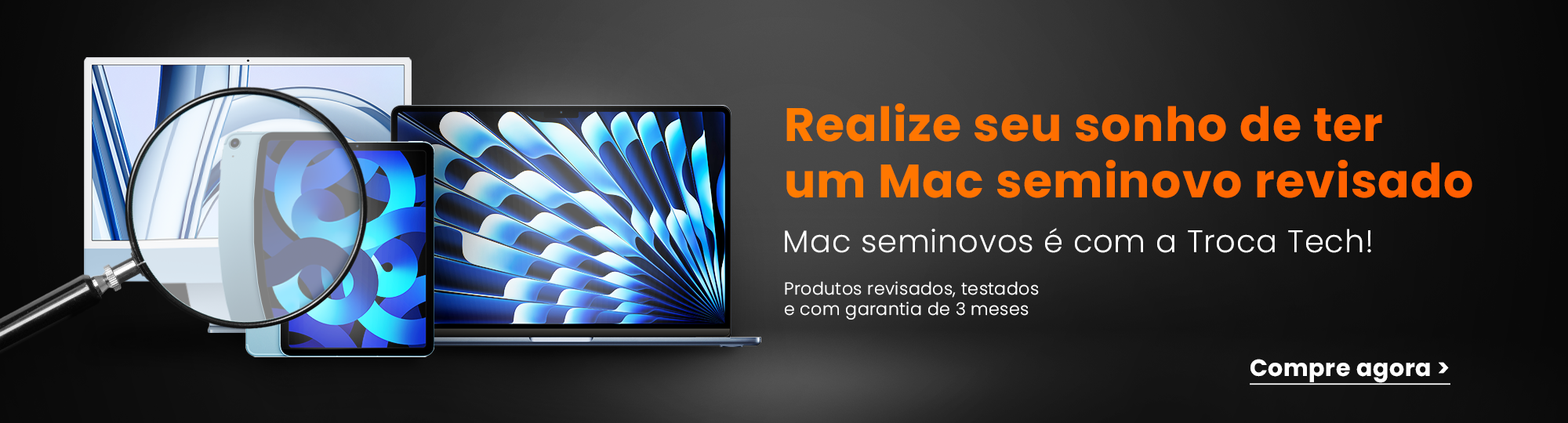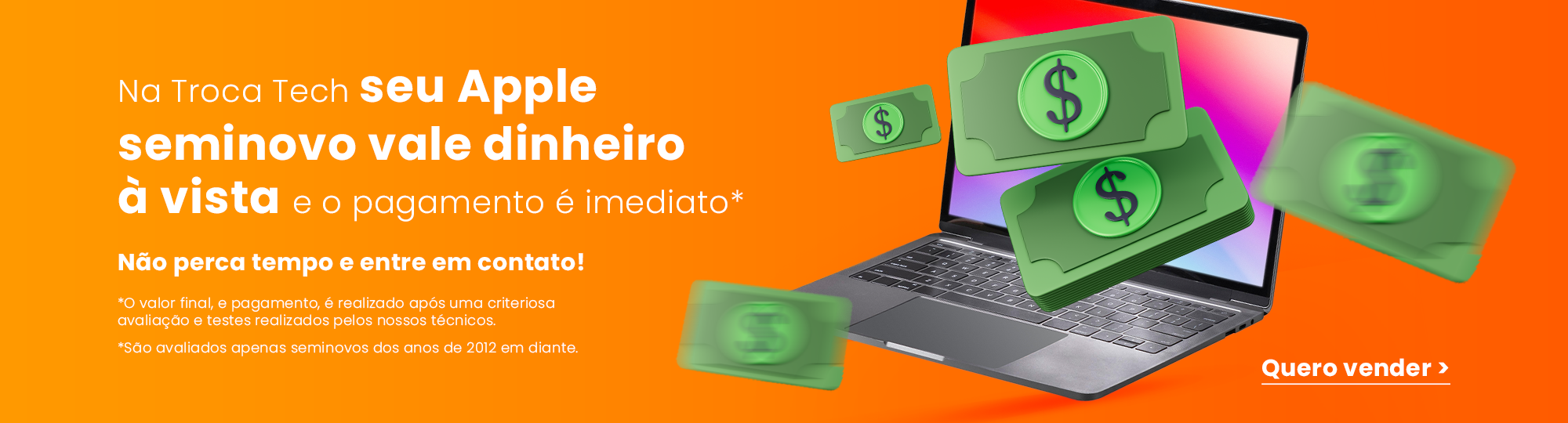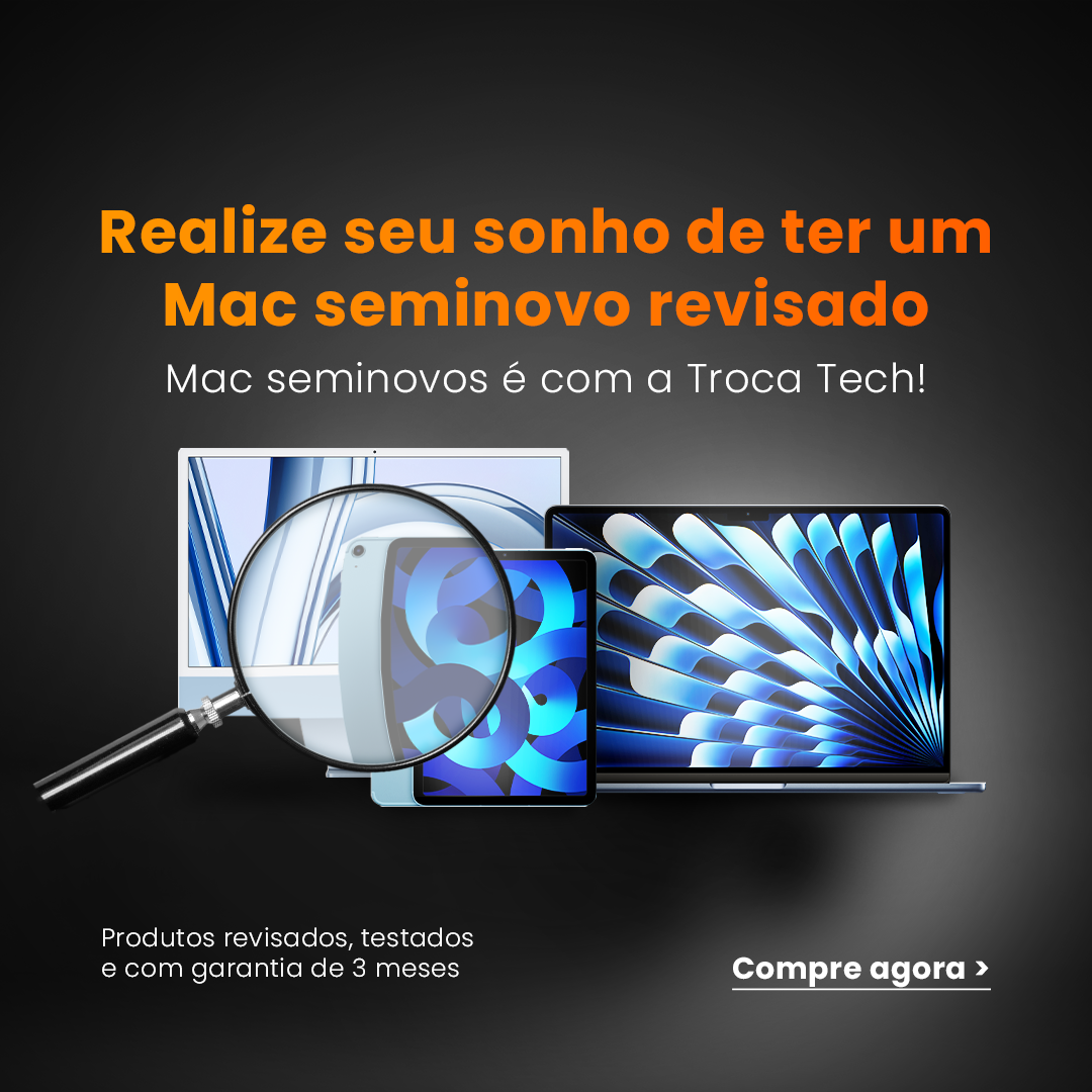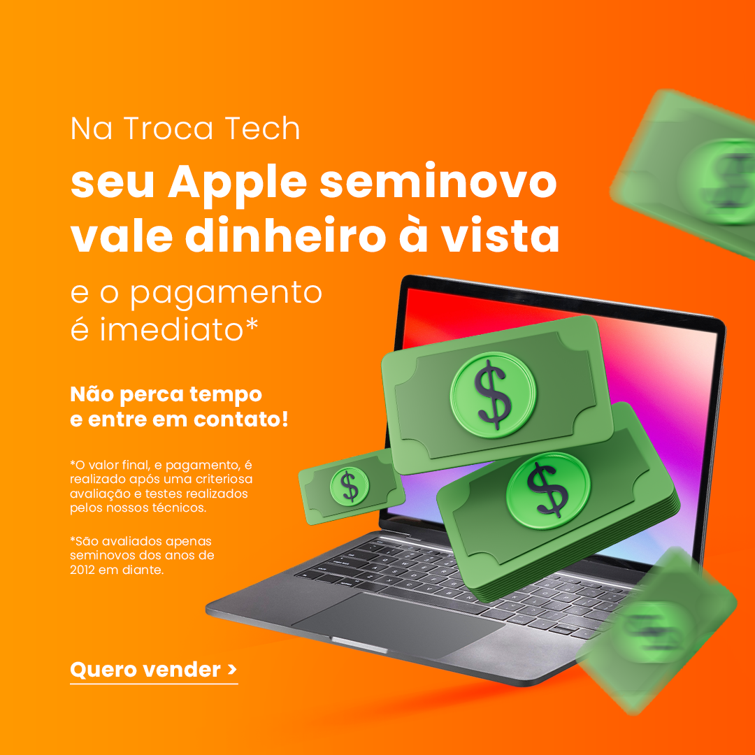Na Troca Tech, todos os produtos seminovos passam por um rigoroso processo de revisão para garantir o melhor custo-benefício e muito mais segurança pra você, reforçando nosso compromisso com a qualidade e confiança. Somos uma empresa especializada em compra e venda de toda a linha de dispositivos Apple - modelos a partir de 2012: iMac, MacBook, Mac Mini e iPad.